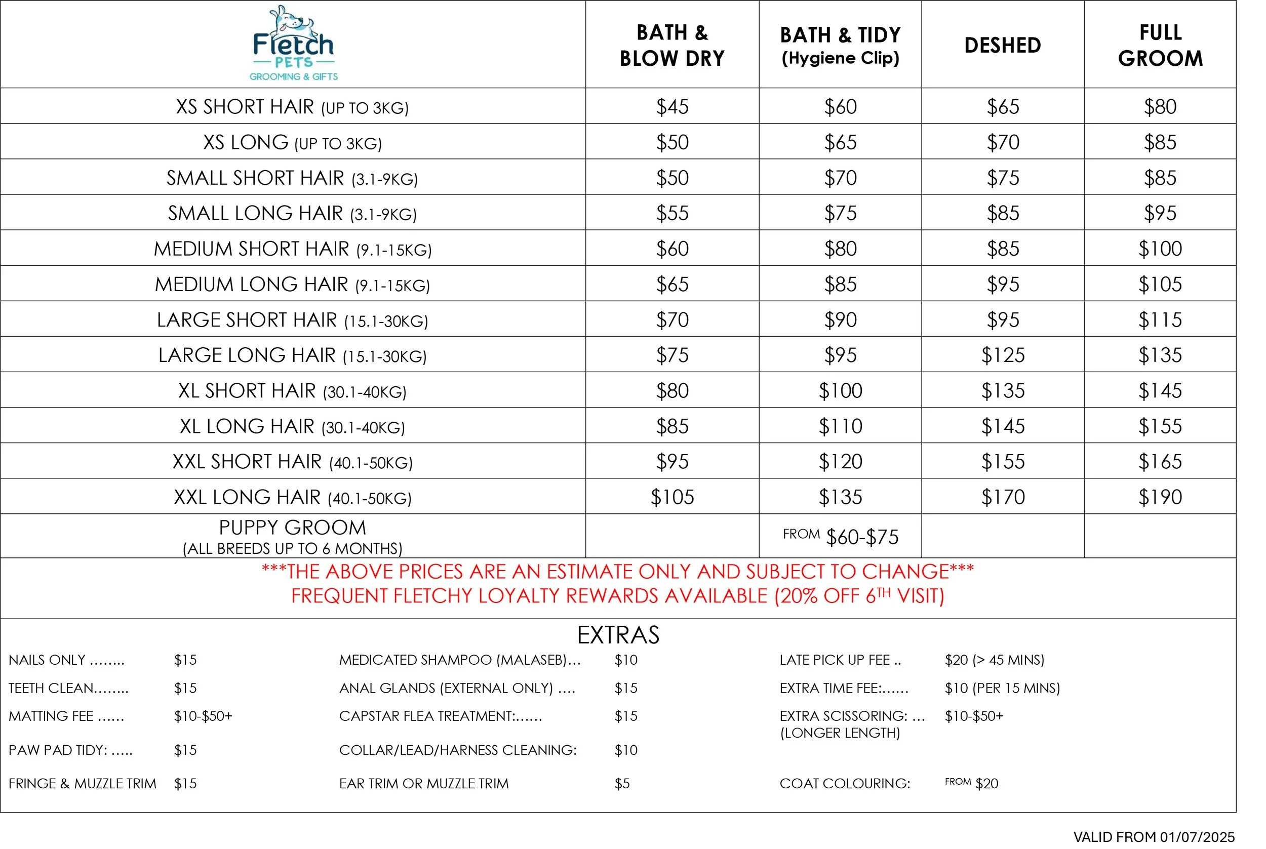 Service will include a relaxed warm bath with our premium shampoo & conditioner. Gentle brush out and blow dry. Nail trim, ear clean and general tidy up.
