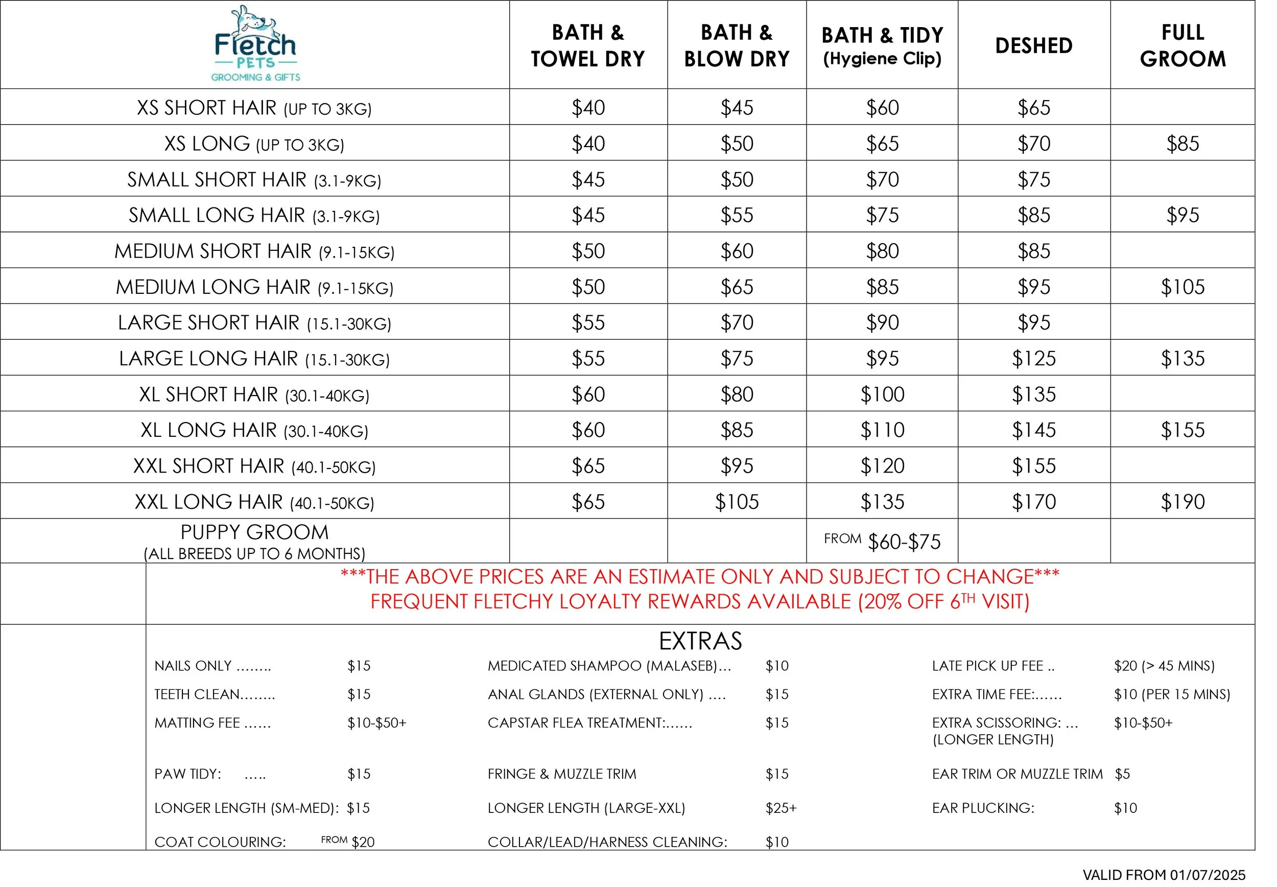 Service will include a relaxed warm bath with our premium shampoo & conditioner. Gentle brush out and blow dry. Nail trim, ear clean and general tidy up.